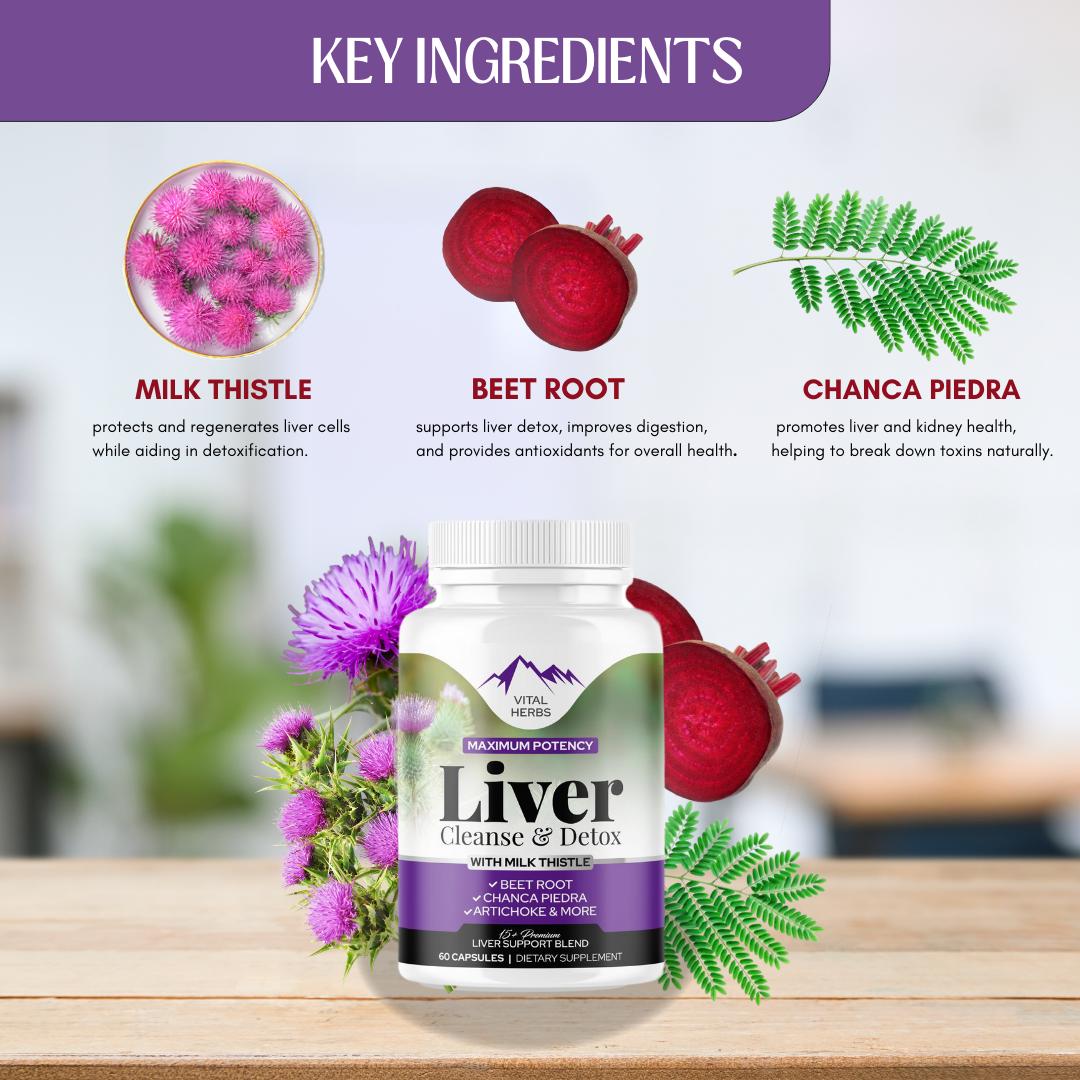 Liver Cleanse & Detox is a natural supplement designed to support your liver’s detoxification process, improve digestion, and boost overall well-being.
